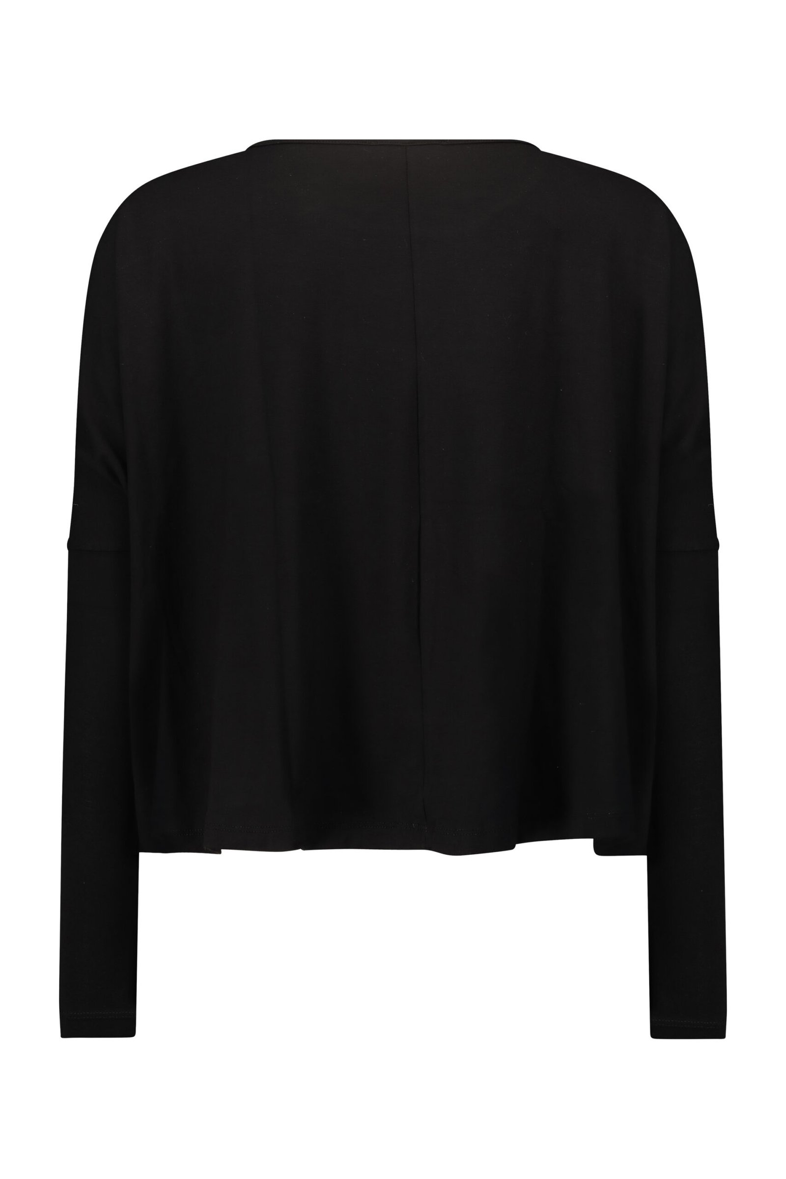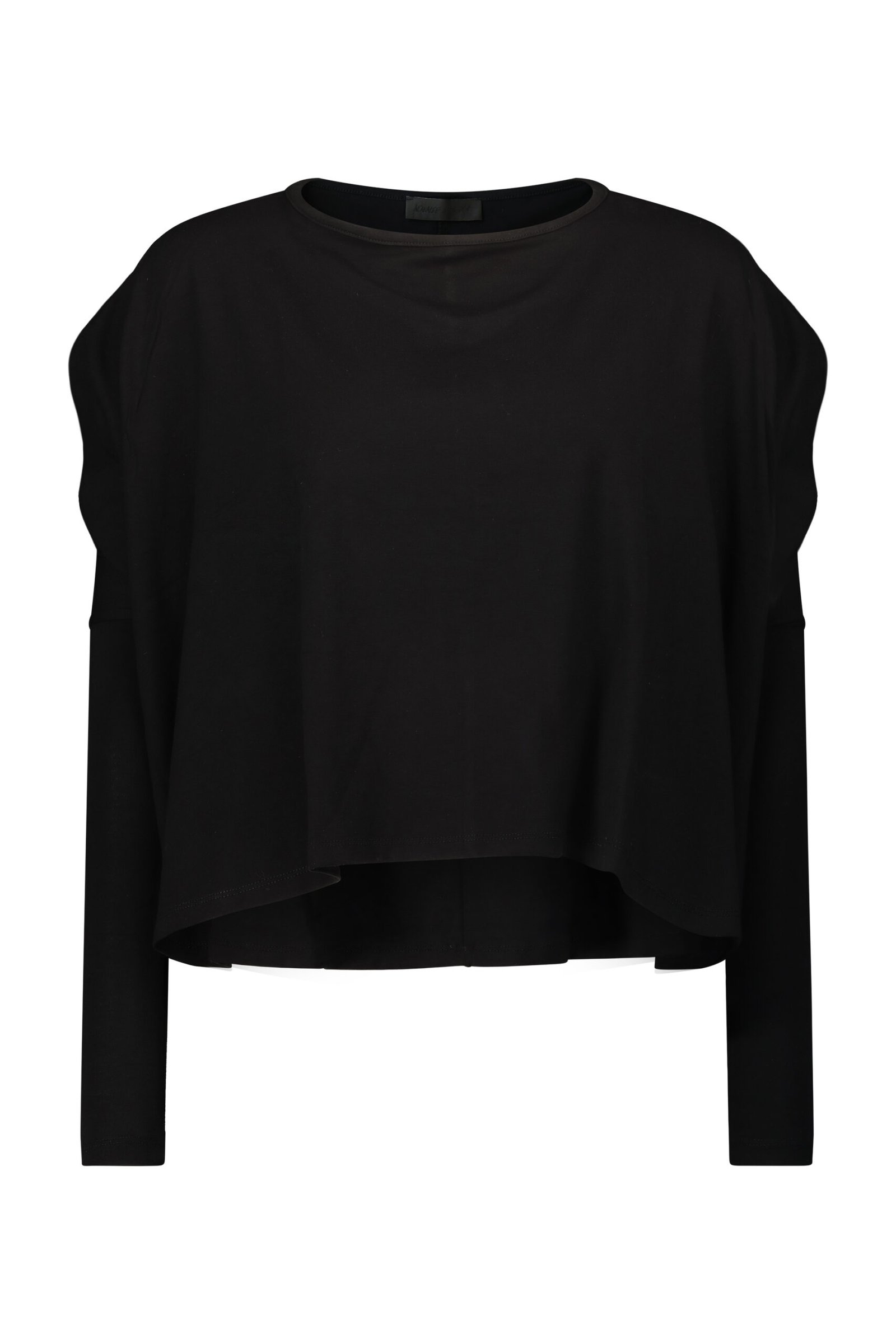 Son col bateau discret apporte une touche féminine et élégante, tandis que le volume maîtrisé du buste crée une silhouette harmonieuse, jamais excessive. Le jeu de contraste se poursuit au niveau des manches : larges jusqu’au coude, elles deviennent ensuite ajustées pour structurer la ligne du bras. Le détail du passe-pouce intégré, façon mitaine, ajoute une signature mode affirmée et un confort supplémentaire.