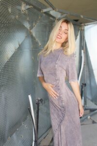 Manches longueur coude Col rond intemporel Coupe asymétrique à la cheville Matière stretch, douce et confortable Fronces avant en forme d’arabesque pour mettre en valeur la silhouette Disponible en 3 coloris : Noir, Gris, Beige Tailles disponibles : T1 : XS/S/M T2 : M / L